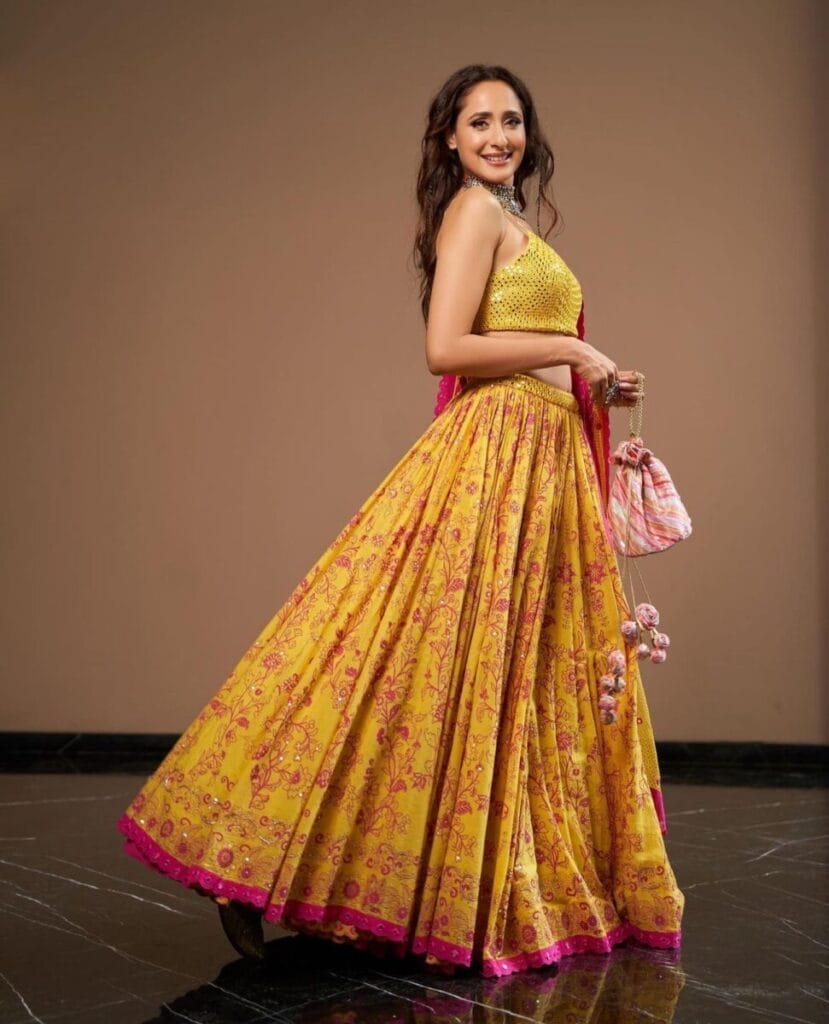 1. Pragya Jaiswal – Yellow Glow on Day 1 Yellow marks the beginning of Navratri, representing joy and brightness. Take notes from Pragya Jaiswal, who radiates elegance in her beautiful yellow outfit. Whether you go for a classic lehenga or a fusion saree, yellow is sure to light up your festive spirit!