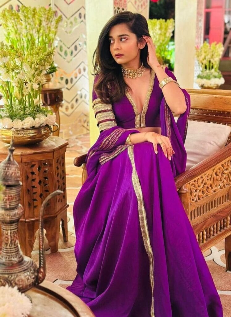 2. Mithila Palkar – Purple Vibes for Day 2 Purple symbolizes creativity and uniqueness. Mithila Palkar effortlessly pulls off this royal color with her chic and modern traditional ensemble.